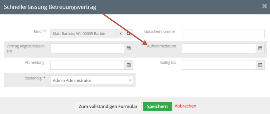 Füllen Sie im sich öffnenden Fenster das Feld „Aufnahmedatum“ aus, damit das Kind in die Berechnung einbezogen wird.