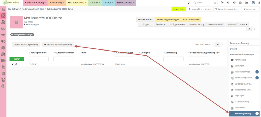 Um ein Kind in die Berechnung einzubeziehen, müssen Sie auch den „Betreuungsvertrag“ erstellen. Dabei handelt es sich um einen allgemeinen Vertrag, in dem beispielsweise festgelegt wird, wie lange das Kind im Kindergarten bleiben wird. Dies geht aus dem „Betreuungsvertrag“ des Kindes hervor. Um einen Datensatz zu erstellen, klicken Sie auf die Schaltfläche „Betreuungsvertrag erstellen“.
